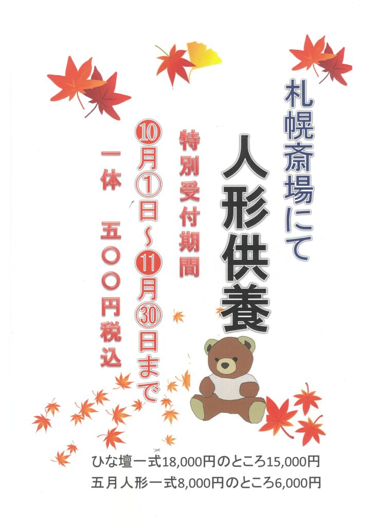 斎場で人形供養受付 2025.09.19 隣接札幌斎場にて人形供養を下記の通り承ります詳しくは「札幌斎場011−821−0631」にお問い合わせ下さい < 前の記事を見る | 新着情報一覧へ | 次の記事を見る >